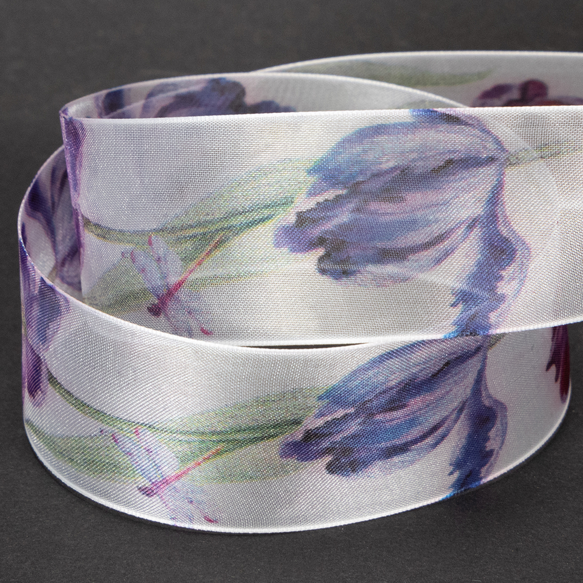 Organzabånd, chiffonbånd, papegøyetulipaner, lilla, 40 mm, 18 m