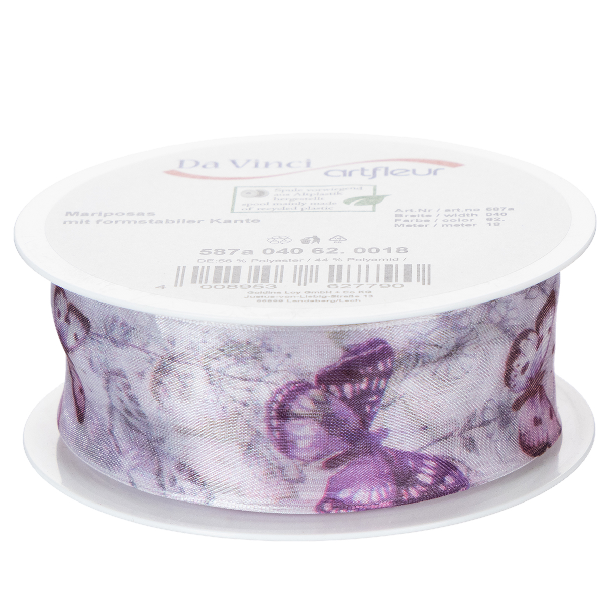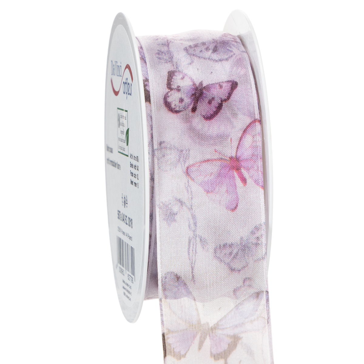Sommerfuglene som er avbildet i detalj tilhører ulike, eksotiske og spesielt vakre arter, noe som gjør at motivet fremstår som svært sofistikert. Det brede chiffonbåndet har et delikat og lett utseende takket være det gjennomsiktige organzastoffet, mens kanten sørger for at sløyfene beholder formen.