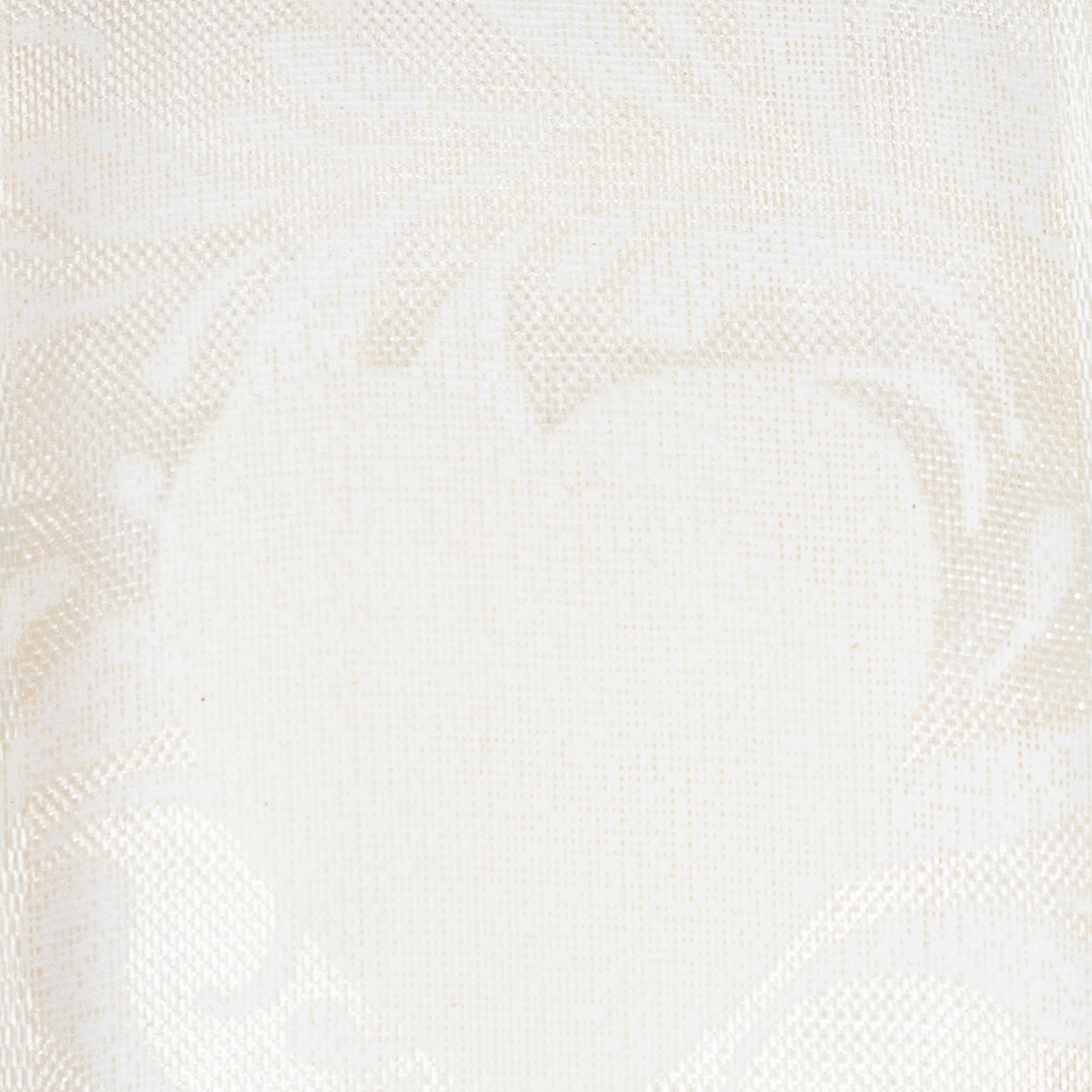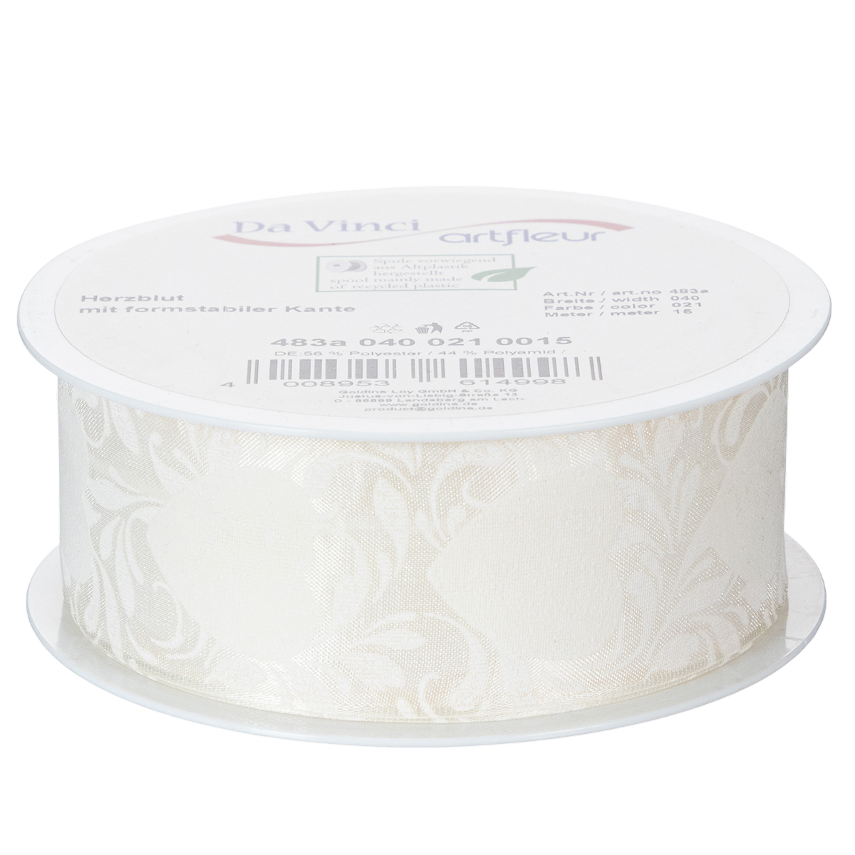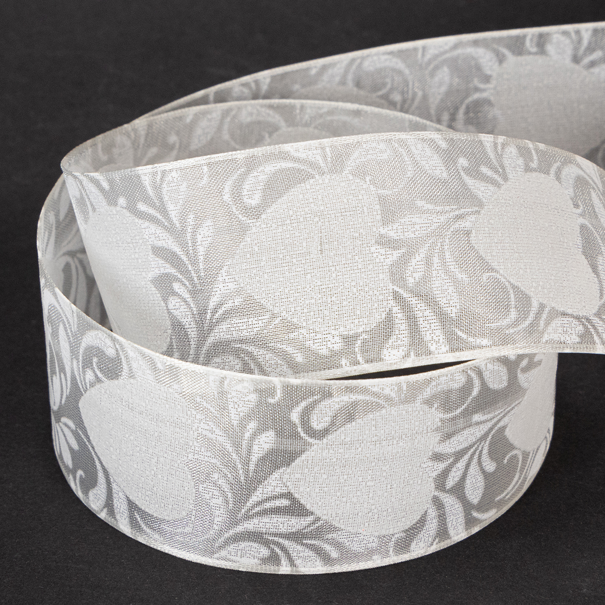 De delikate hjertene er omgitt av bladrike grener som blomster og trykt på det gjennomsiktige organzastoffet, noe som gir båndet et sofistikert utseende som minner om blonder. Den varme kremtonen på dekorbåndet er tidløs og formidler samtidig en viss nostalgi.
