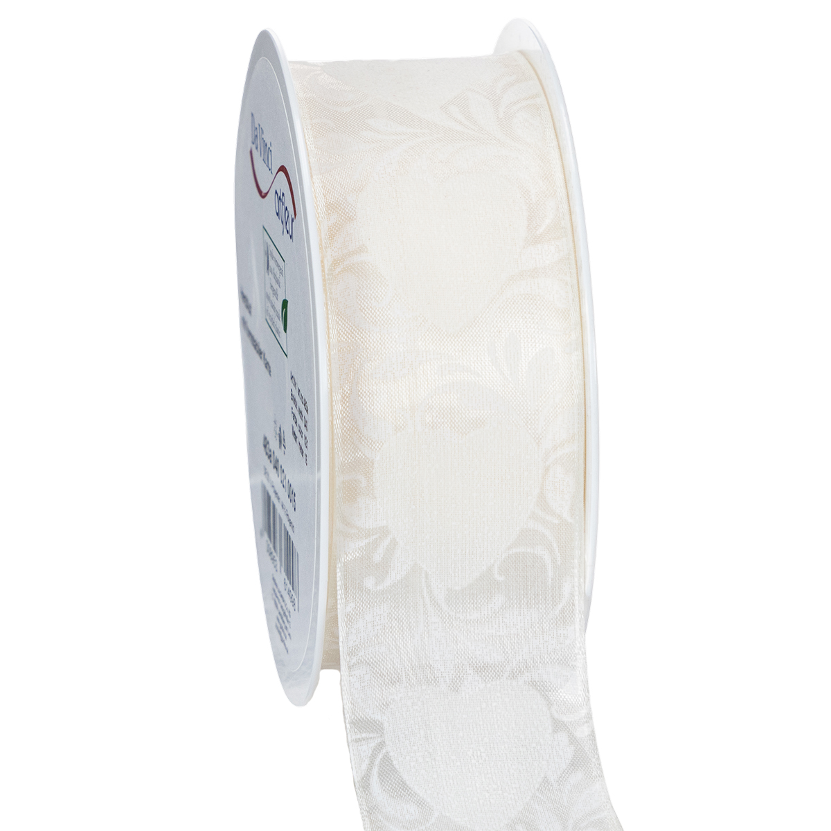 Produktnavn: Organzabånd, kremfarget, dekorativt bånd med hjerter, 40 mm bredt, 15 m langt