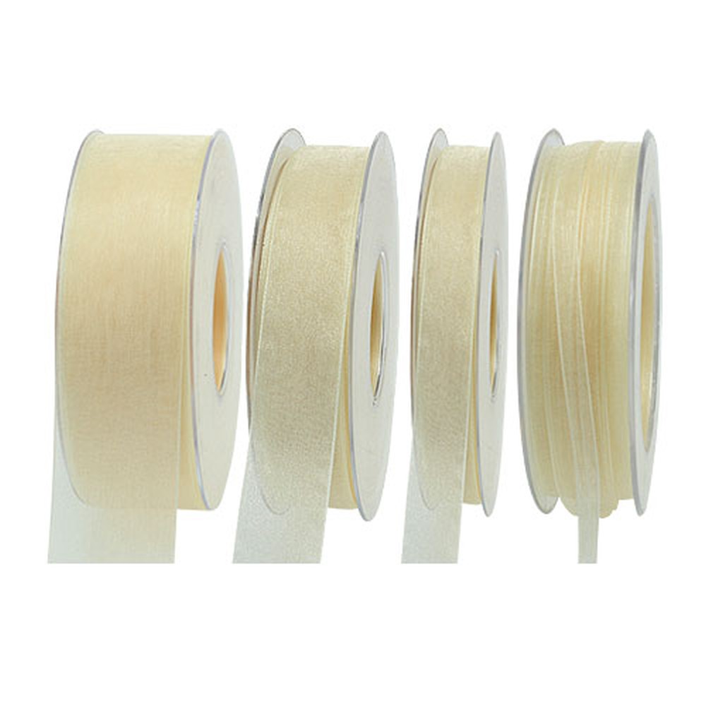 Hvert organzabånd med krem i kremen er viklet på en plastrulle og er rundt 50 meter langt. Stroppene er hver laget av 100% polyester.