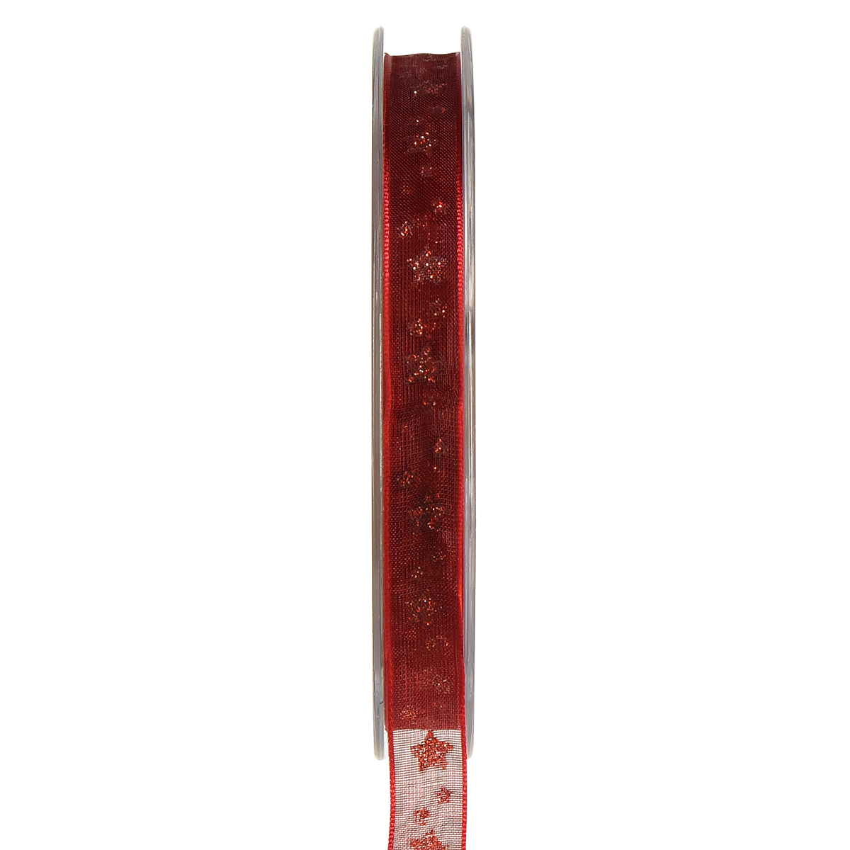 Organzabånd rødt med glitrende stjerner – Julebånd 10mm 20m