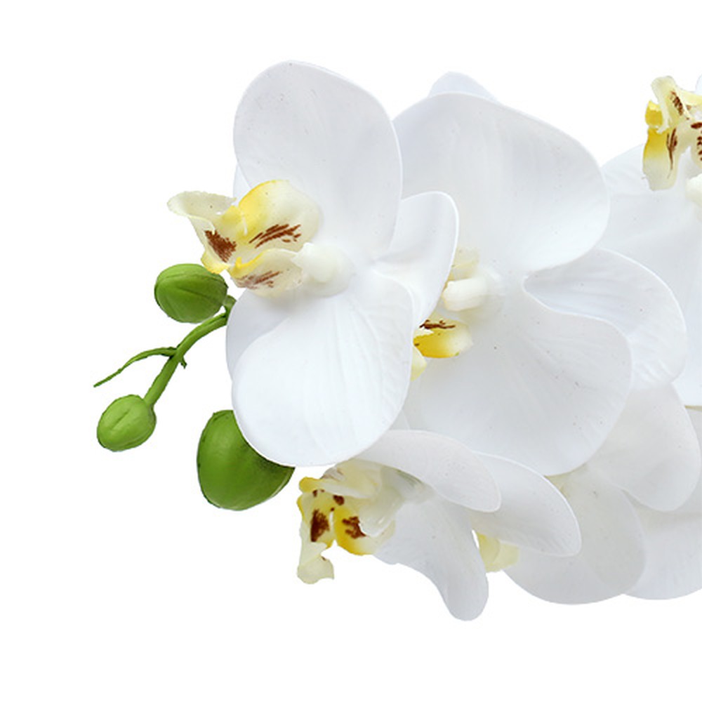 Den hvite orkidégrenen er ca 58 centimeter lang og dens tolv åpne blomsterhoder har en diameter på ca 6 centimeter og er kronet av tre lukkede blomster på spissen av stilken. Det er en metallstang i kjernen slik at grenen er stabil og oppreist. De små blomstertungene, som er dekorert i gult med lilla flekker, er også veldig magiske. La deg inspirere av denne provoserende kunstige blomsten!