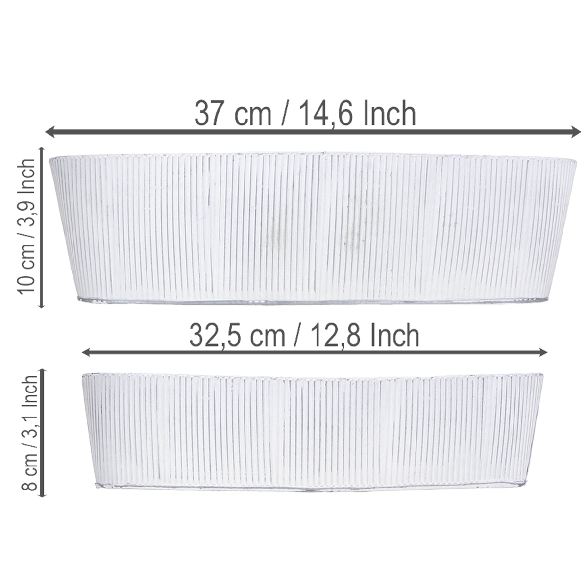 Den ovale metallskålen i hvitt og sølv gir et snev av retro og vintage til hjemmet ditt. Med sin hvitvaskede ytre overflate og sølvbelegg på innsiden, legger disse metallskålene aksenter til rommets innredning. Den enkle, ovale formen appellerer til moderne design, som sømløst kan integreres i en moderne eller skandinavisk interiørstil – ideell som en stilig, elegant borddekorasjon. Kombinert med tilbehør fra metalldekorasjonskategorien til Floristik24, er resultatet et harmonisk helhetsbilde. Den rillede dekoren og kombinasjonen av hvitt og sølv understreker den attraktive glansen og gjør disse skålene til et uunnværlig høydepunkt på enhver skjenk eller spisebord.
