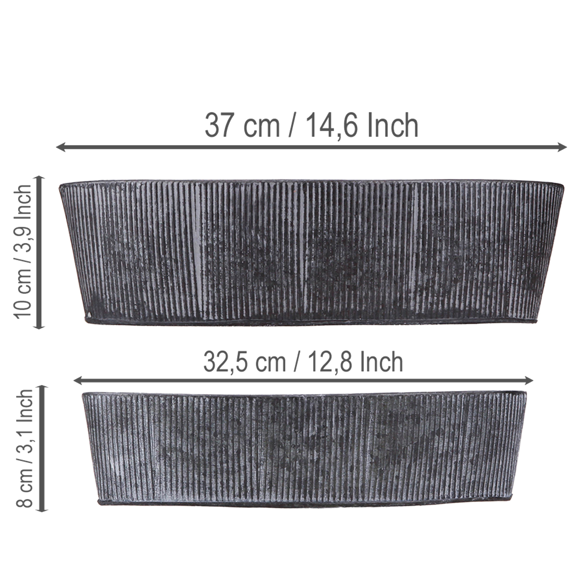 Den ovale skålen laget av metall og svart kombinerer stilig eleganse med en sjarmerende vintage-estetikk som vil fremheve hjemmet ditt. Enten som en iøynefallende dekorativ skål, som en nostalgisk borddekorasjon eller som en rustikk blomsterskål – dette settet med to stabelbare metallskåler åpner for mange kreative muligheter. Det elegante fargevalget i svart, vasket grått, samt det fine rilledesignet harmonerer perfekt med ethvert shabby chic eller industriell stil. Bruk bollene som planteskåler og legg til et grønt høydepunkt med stueplanter eller urter. Den minste er perfekt for stilig nøkkeloppbevaring eller for sukkulenter.