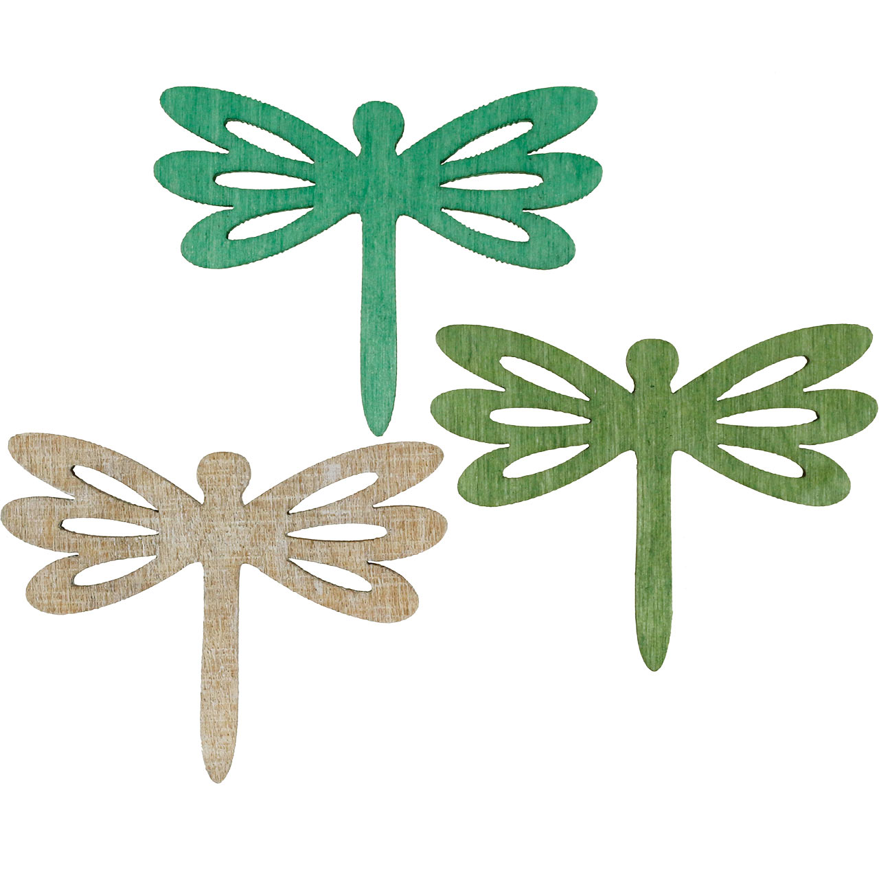 Tre øyenstikkere for spredning kommer til deg i et sett med 48 forskjellige farger i en plastboks. Settet inneholder 16 øyenstikkere hver i grønt, lysegrønt og mynte. Treinsektene har en høyde på ca 3,5 centimeter og en bredde på ca 5 centimeter. Hetteglassets styrke er rundt 2 millimeter.