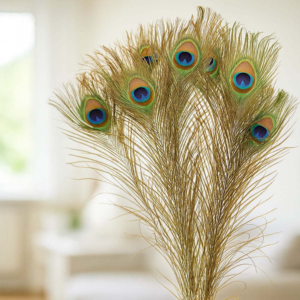 De iriserende påfugløynene er høydepunktet på disse dekorative fjærene. Disse nøye håndplukkede fuglefjærene har en lang, hvit fjærpenn, noe som gjør dem perfekte for vaser, men kan også limes, knyttes eller festes med wire til møbler og dekorasjoner.