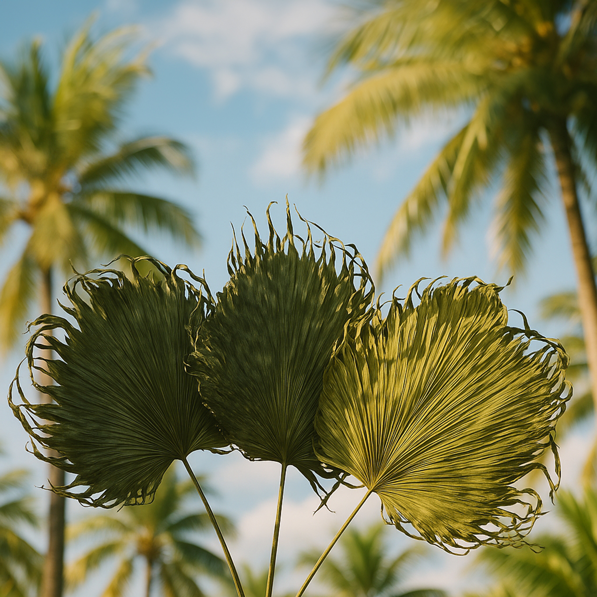 - Sett med 5 tørkede palmeblader av Saribus rotundifolius