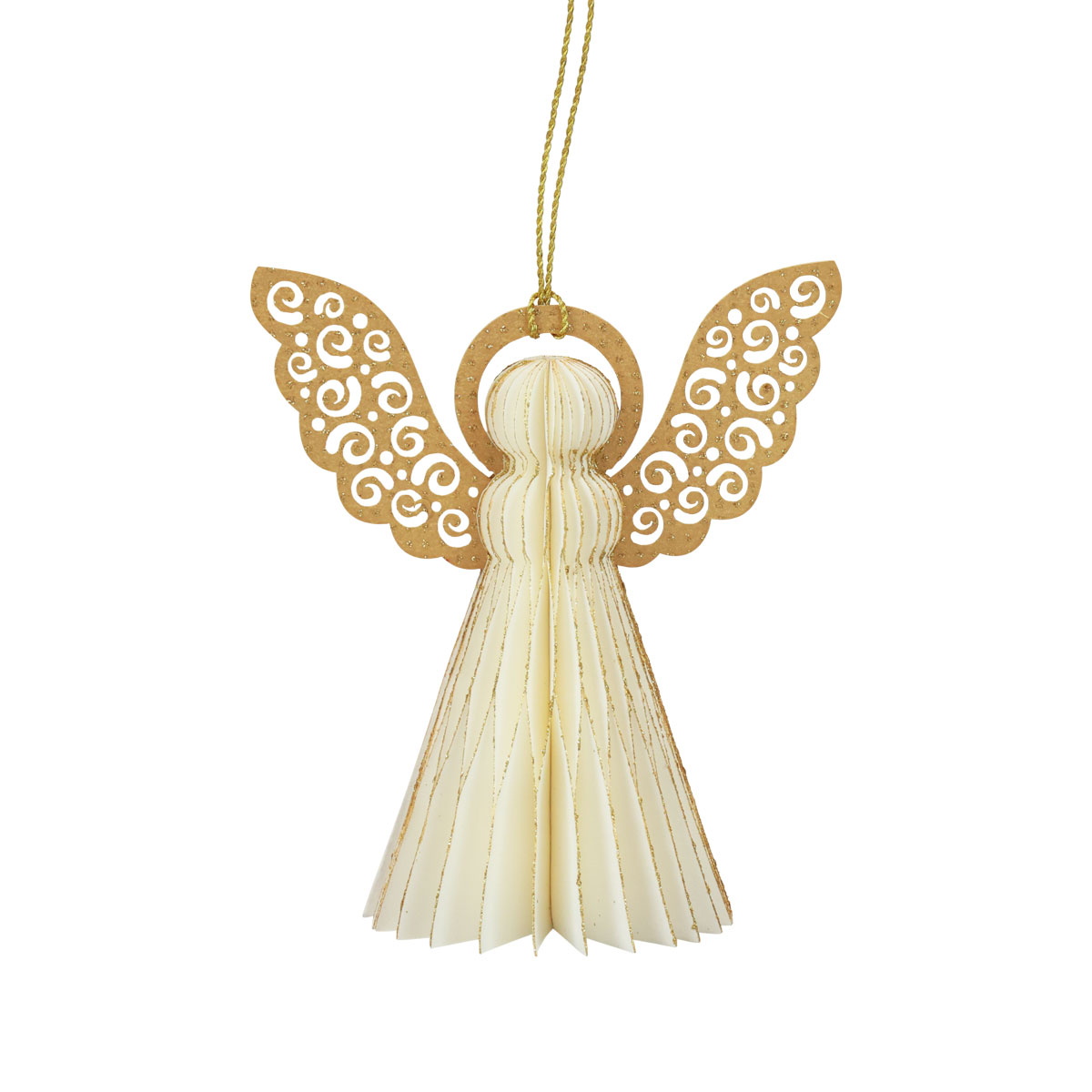 Papirjulepynten består av honeycomb-pynt i hvit og gullpapp med dekor av gullglitter. Med en fargekoordinert snor laget av gullbånd kan engleanhenget henges som tredekorasjon. Men du kan også bruke de pene bikakefigurene som vinduspynt til advent eller som bordpynt på julebordet.