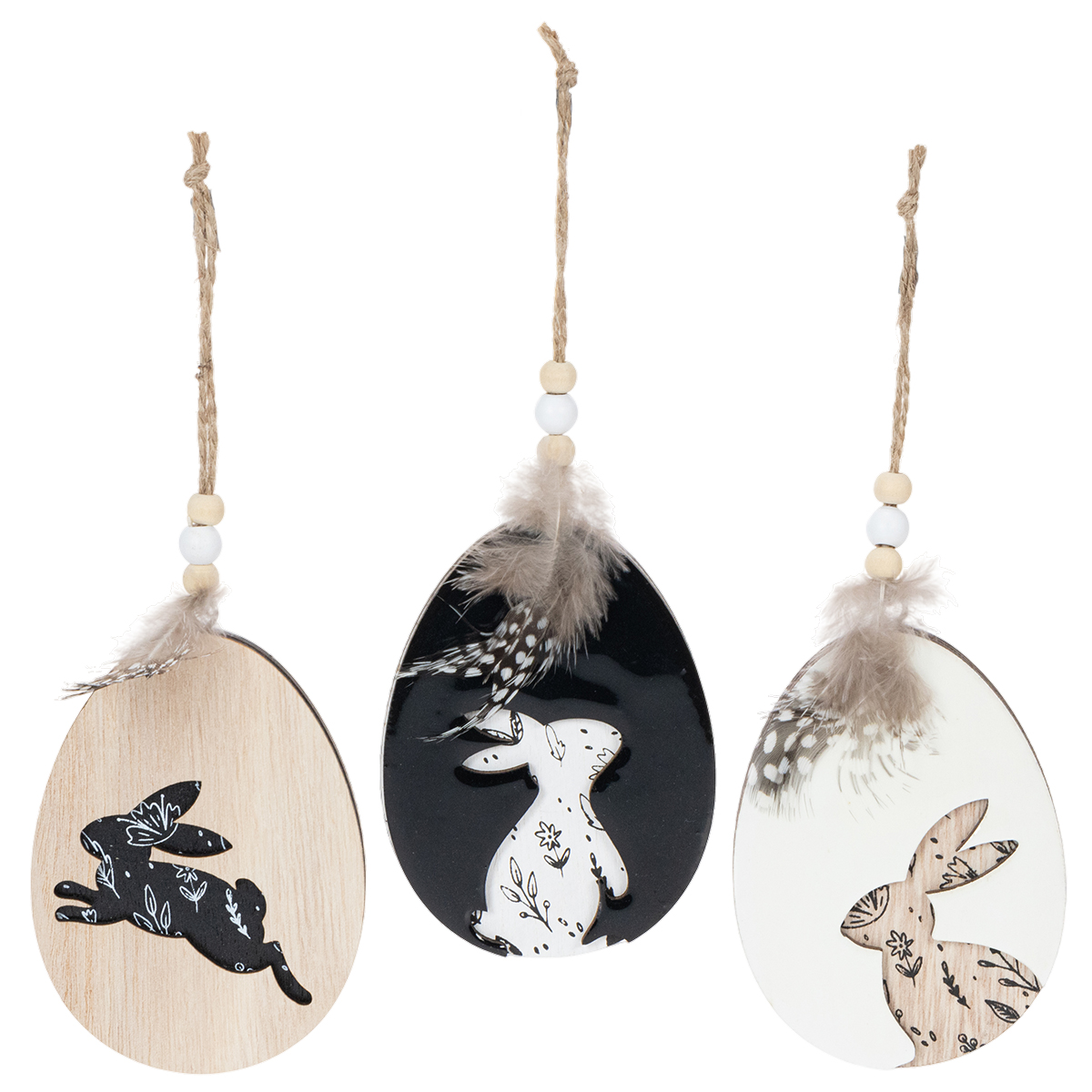 Påskeegg i tre til oppheng, hvite og svarte, 10 cm, 6 stk.