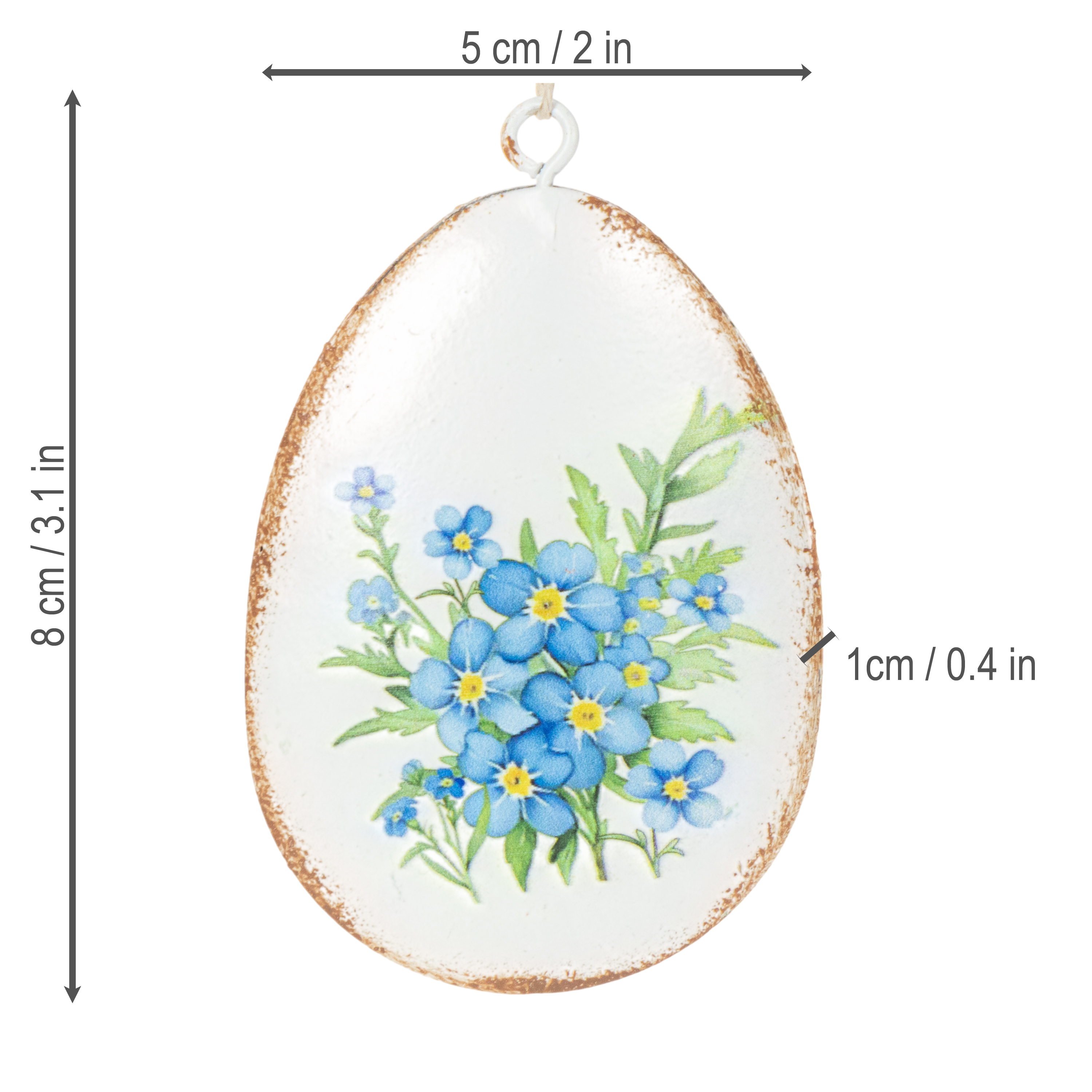 Disse dekorative påskeeggene i metall imponerer med sin størrelse og sitt utseende. Med en høyde på 8 cm og en diameter på 5 cm har de den perfekte størrelsen for en rekke bruksområder. Den litt matte hvite basen kompletteres av fire forskjellige blomstermotiver som bringer våren til live: fra delikate forglemmegei til fargerike påskeliljer. Deres subtile vintage-utseende gjør dem spesielt smakfulle og en perfekt match for retro-, shabby chic- eller landlig dekorasjon.