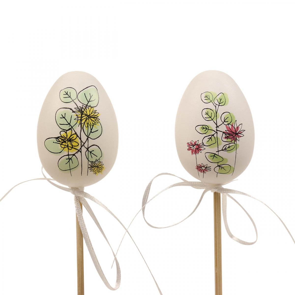 De hvite eggene har spraglete løvverk og blomstermotiver i nyanser av grønt, rødt og gult. Hvert påskeegg er festet til en trepinne og kan brukes til å dekorere buketter og påskearrangementer. Takket være den spisse enden kan du enkelt sette plantepluggene inn i blomsterskum, polystyren eller pottejord.
