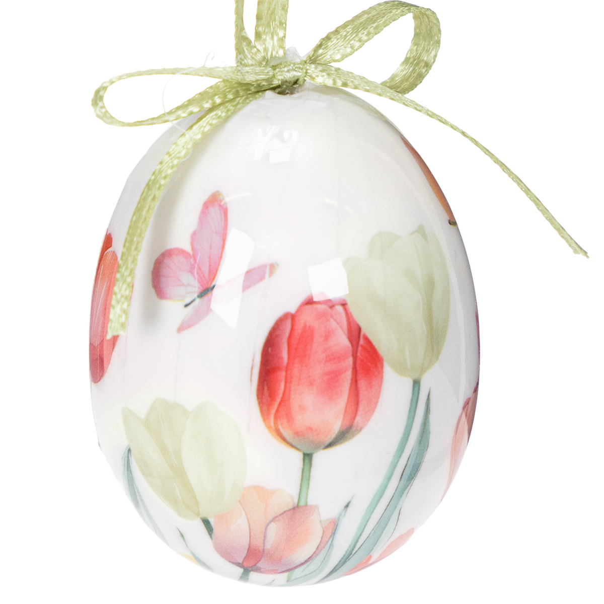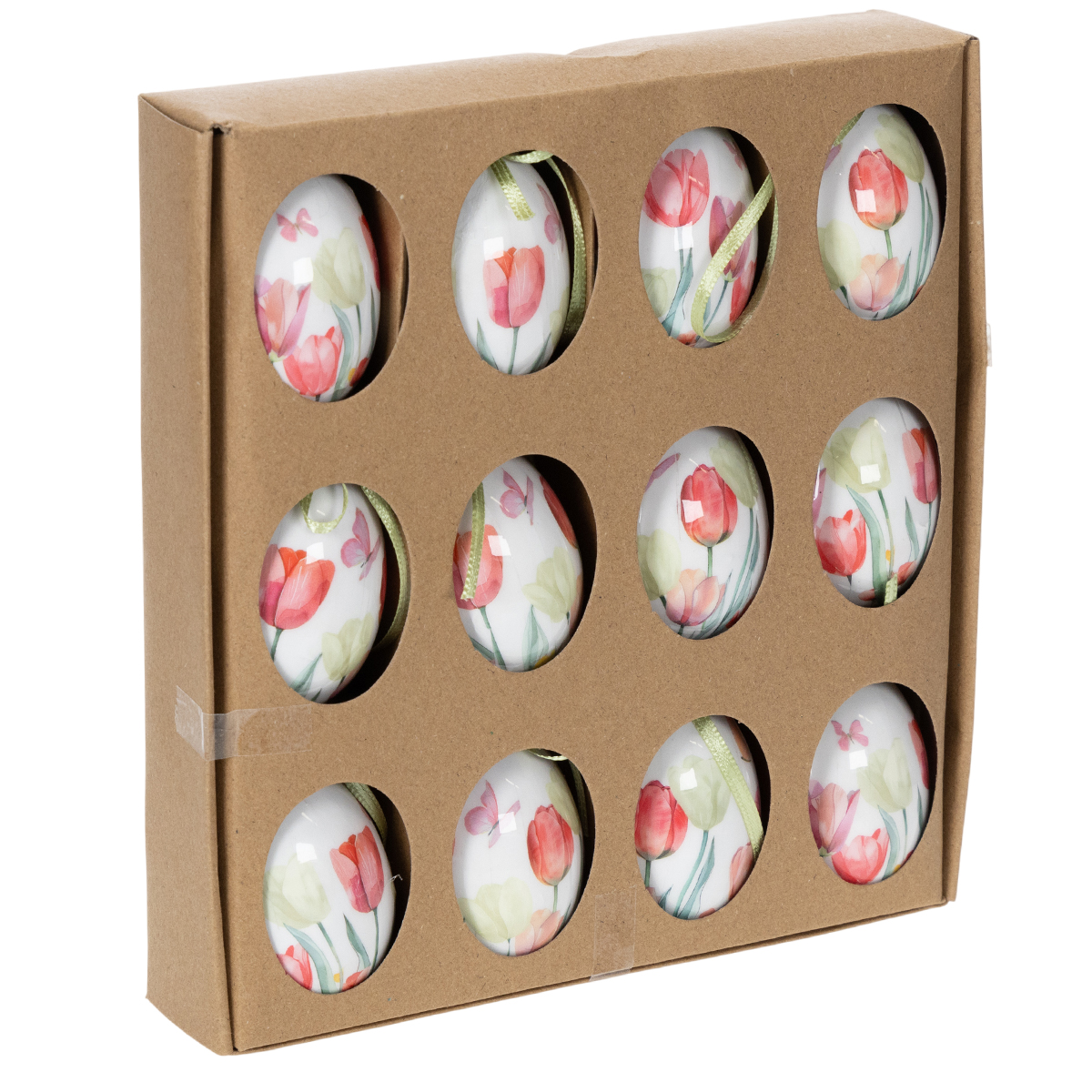 Påskeeggdekorasjon, tulipanmotiv med bånd til oppheng og vårdekorasjon, 6 cm, 12 stk.
