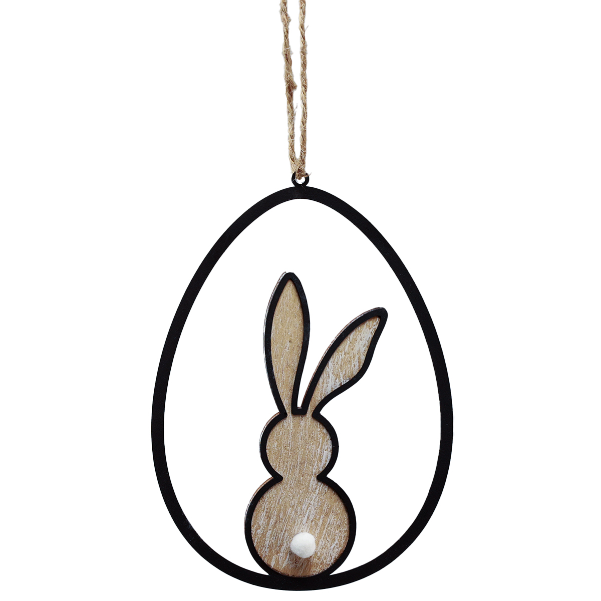 Den lille dekorative figuren til påske sitter i en svart metallramme i form av et stort påskeegg. Figuren, skåret ut av lett hvitnet tre, er også innrammet av svart metall. Det som er spesielt søtt med de små påskeharene som anheng er den hvite halen som var spesielt festet.
