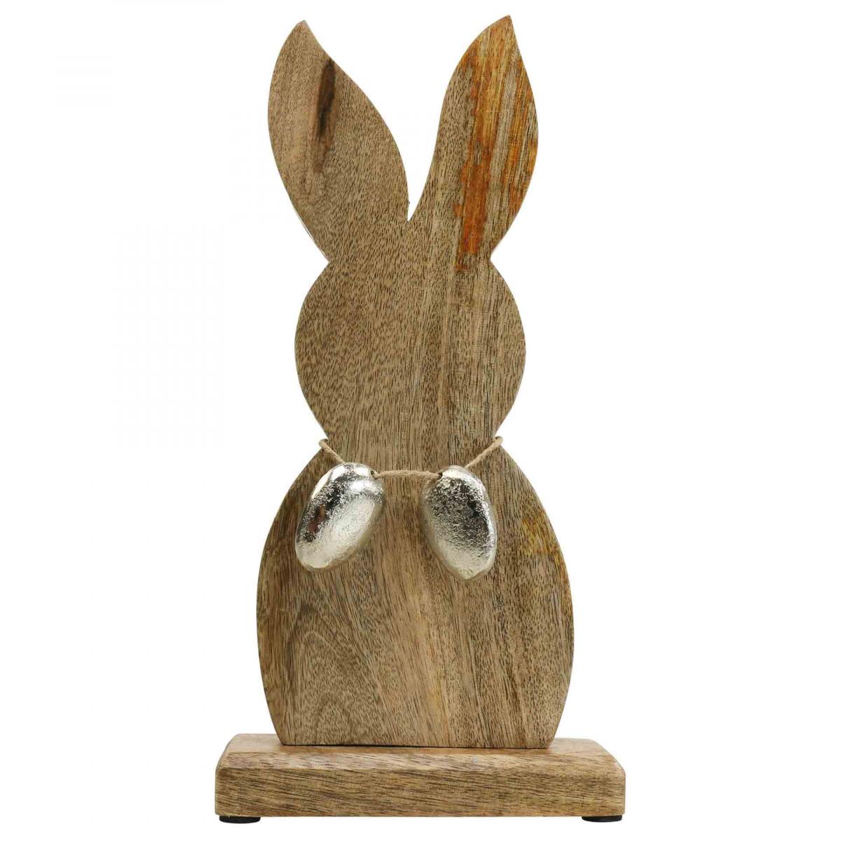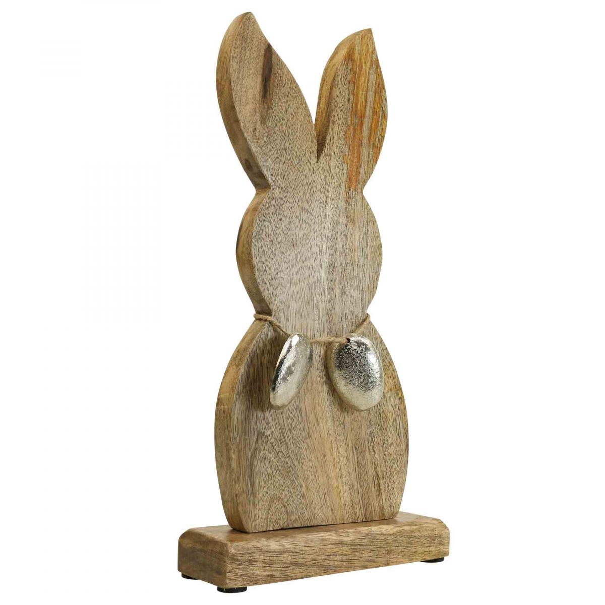 For det er kun de mest fortjente påskeharene som får merket med sølvegget. Til påskedekorasjonen er kaninen laget av solid mangotre som en slående silhuett og sitter på et pålitelig stativ. Så trekaninen er klar for redet.