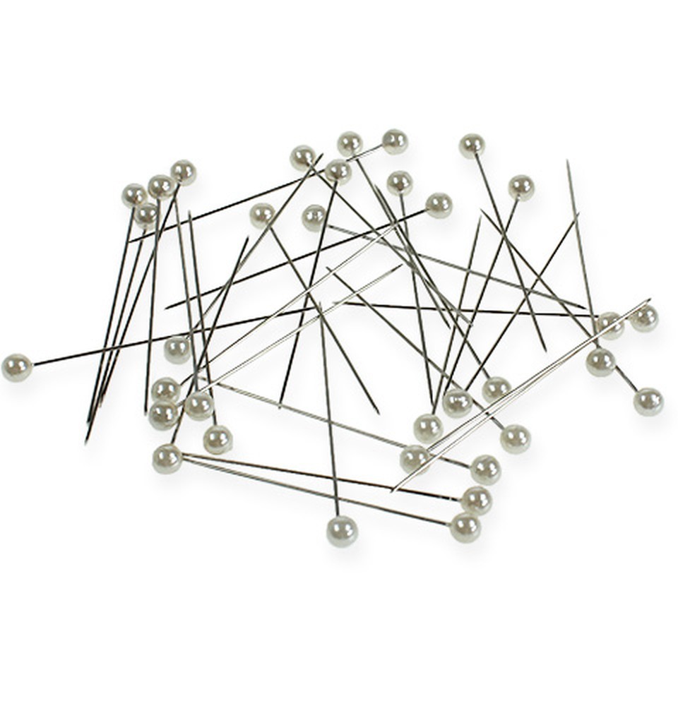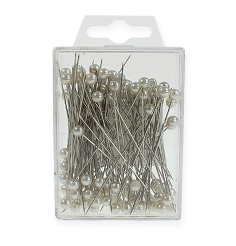 Perlenålene i hvitt leveres i en praktisk hengekasse med 100 eksemplarer hver. En nål er omtrent 65 millimeter lang; perlen har en diameter på ca 6 millimeter.