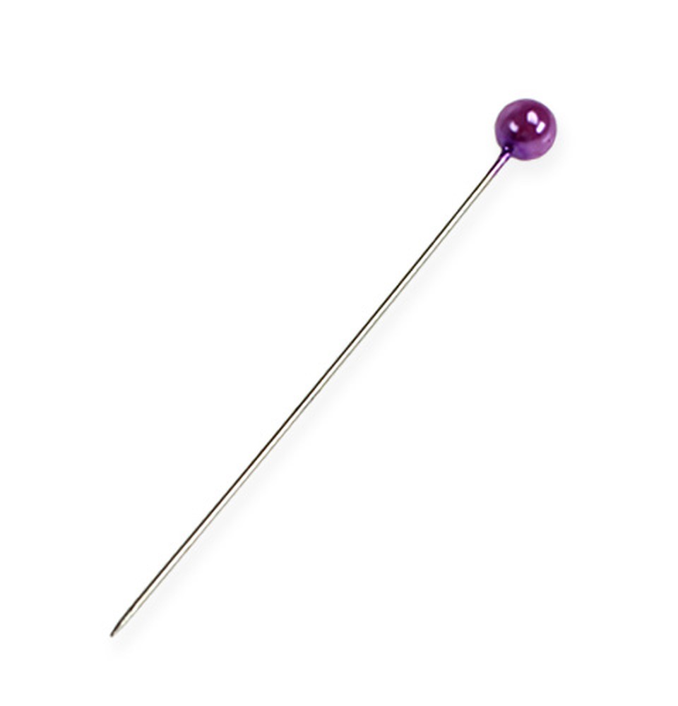 Perlehodepinnene i lilla leveres i en praktisk hengekasse med 100 eksemplarer hver. En nål er omtrent 65 millimeter lang; perlen har en diameter på ca 6 millimeter.