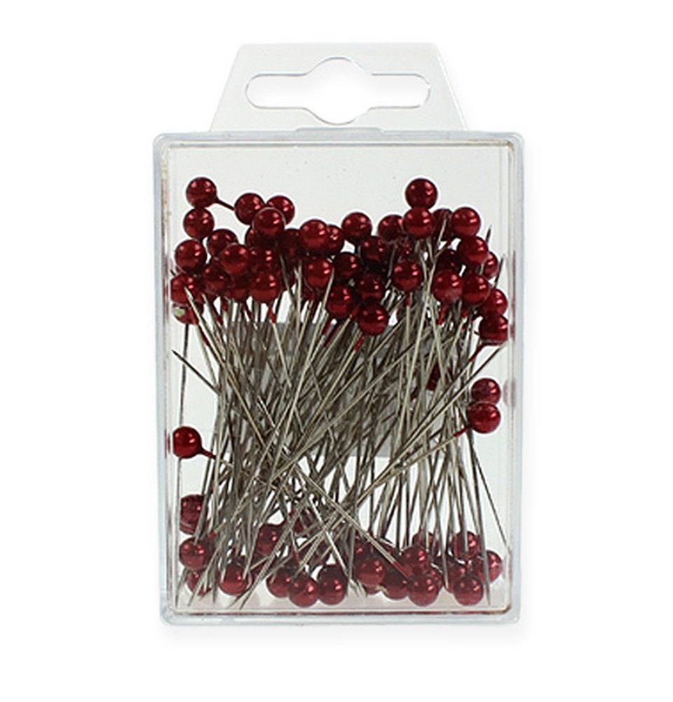 Perlehodede nåler i rødt leveres i en praktisk hengekasse med 100 eksemplarer hver. En nål er omtrent 65 millimeter lang; perlen har en diameter på ca 6 millimeter.