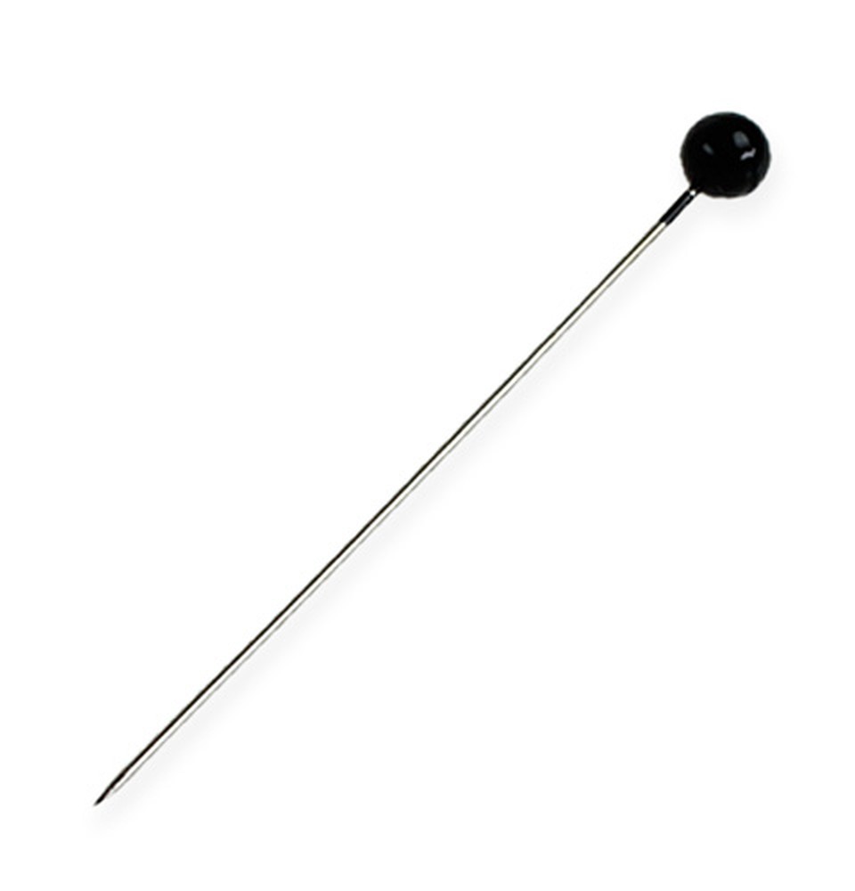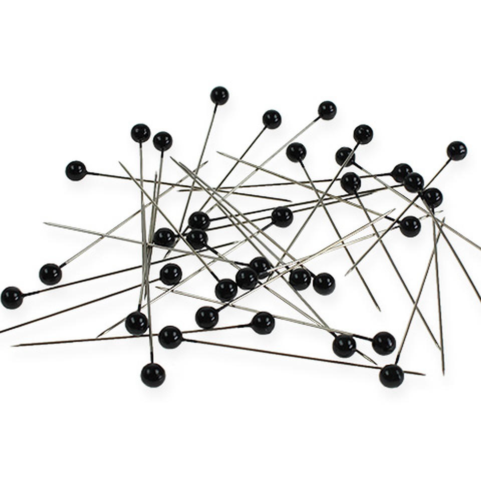 Perlehodede nåler i sort leveres i en praktisk hengekasse med 100 eksemplarer hver. Lengden deres er omtrent 65 millimeter; perlens diameter ca 6 millimeter.