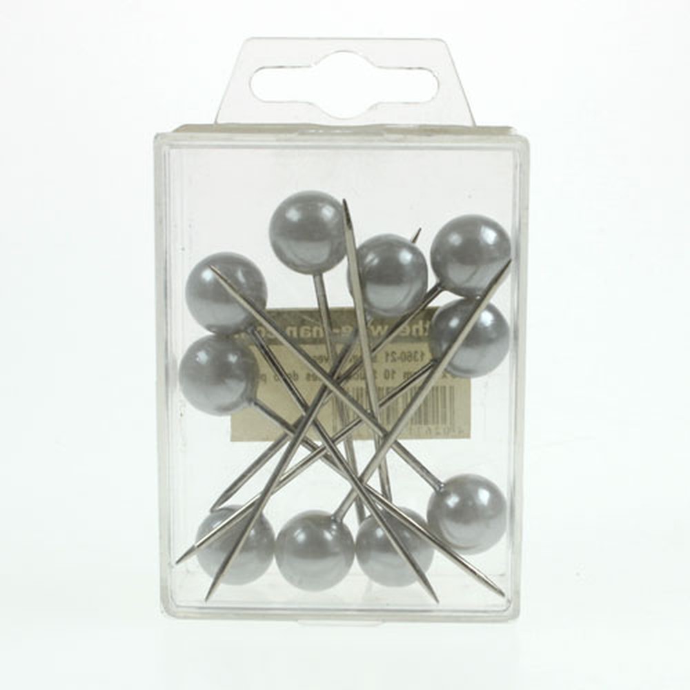 Her får du 10 perlehodenåler i sølv i en hendig plastboks. Hver nål er rundt 75 millimeter lang, og hver perle er rundt 15 millimeter i diameter.