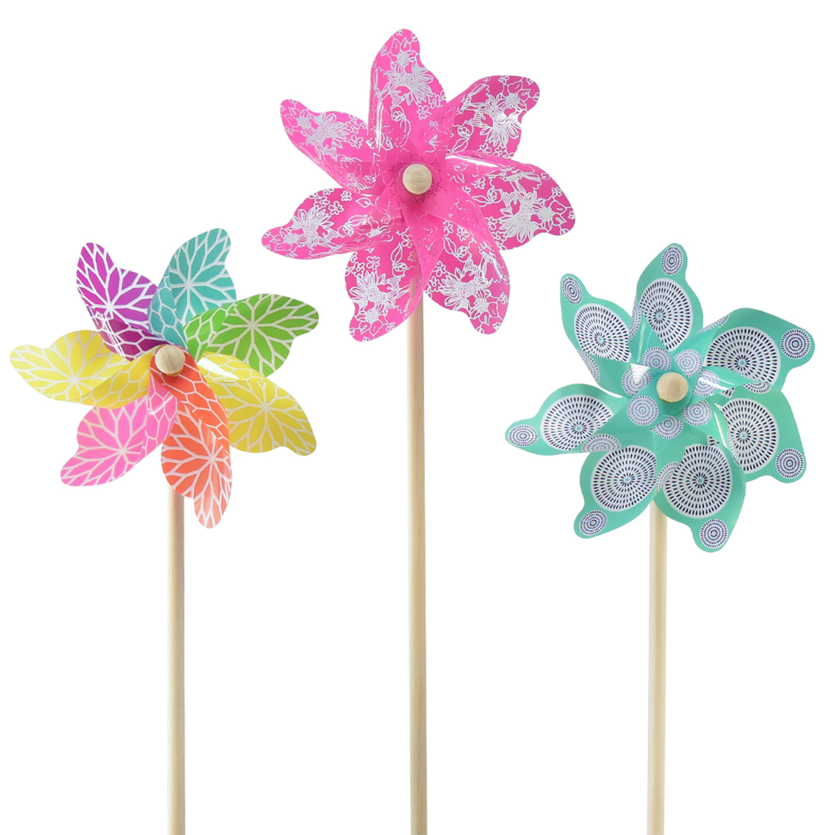 Du får totalt 3 vindturbiner som er forskjellige i mønster og farge. Den ene vindmøllen er rosa og dekorert med et delvis gjennomsiktig blomstermønster. Det turkise hjulet har svarte og hvite sirkler og det tredje har en annen farge på hvert blad, med en stor blomst med hvit kant.