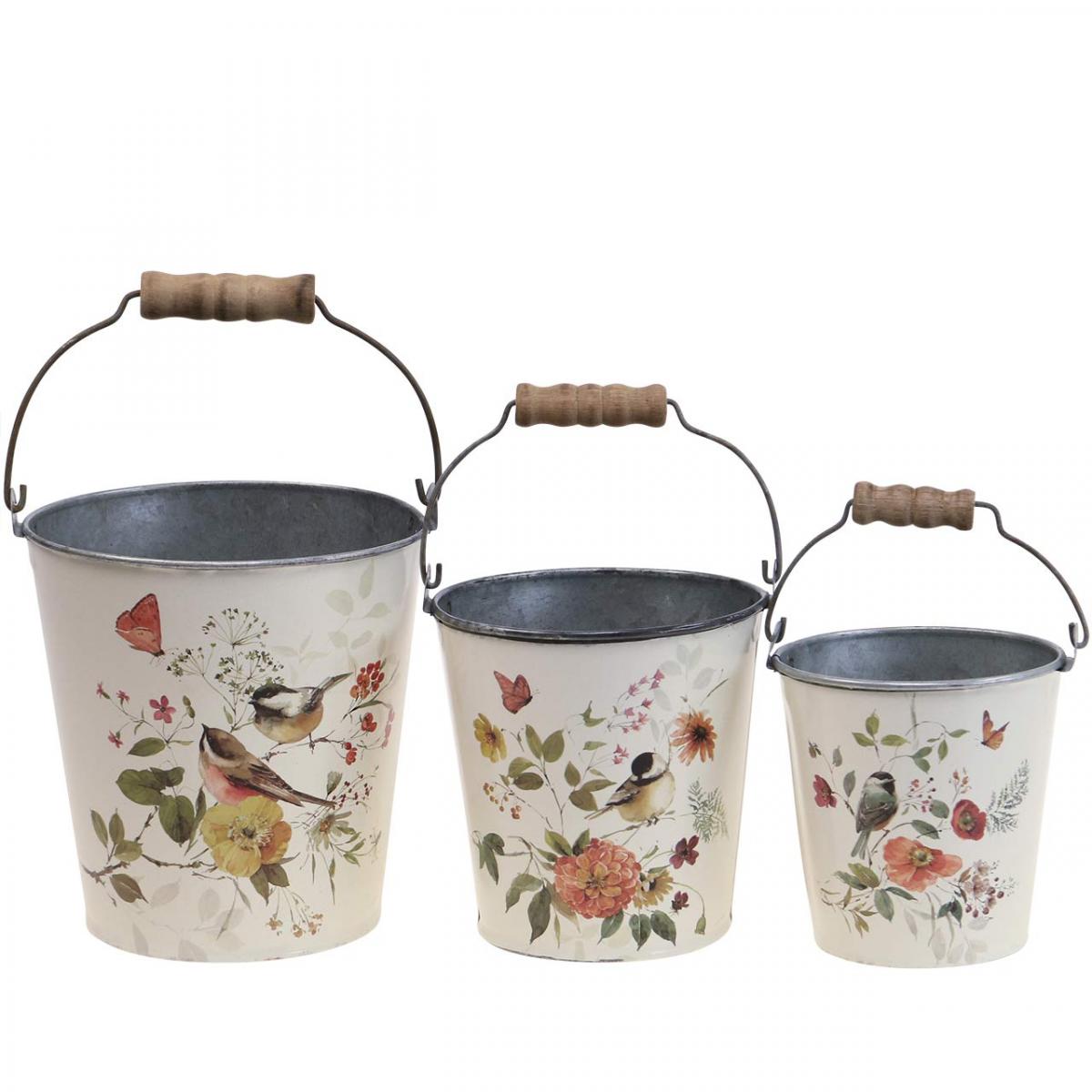 Den lille plantekassen i form av en metallbøtte er metalldekor i en romantisk, antikk stil. Den kremfargede dekorative bøtta med de nostalgiske fuglene og hageblomstene gjør planter til våren like vakre som til sommeren.