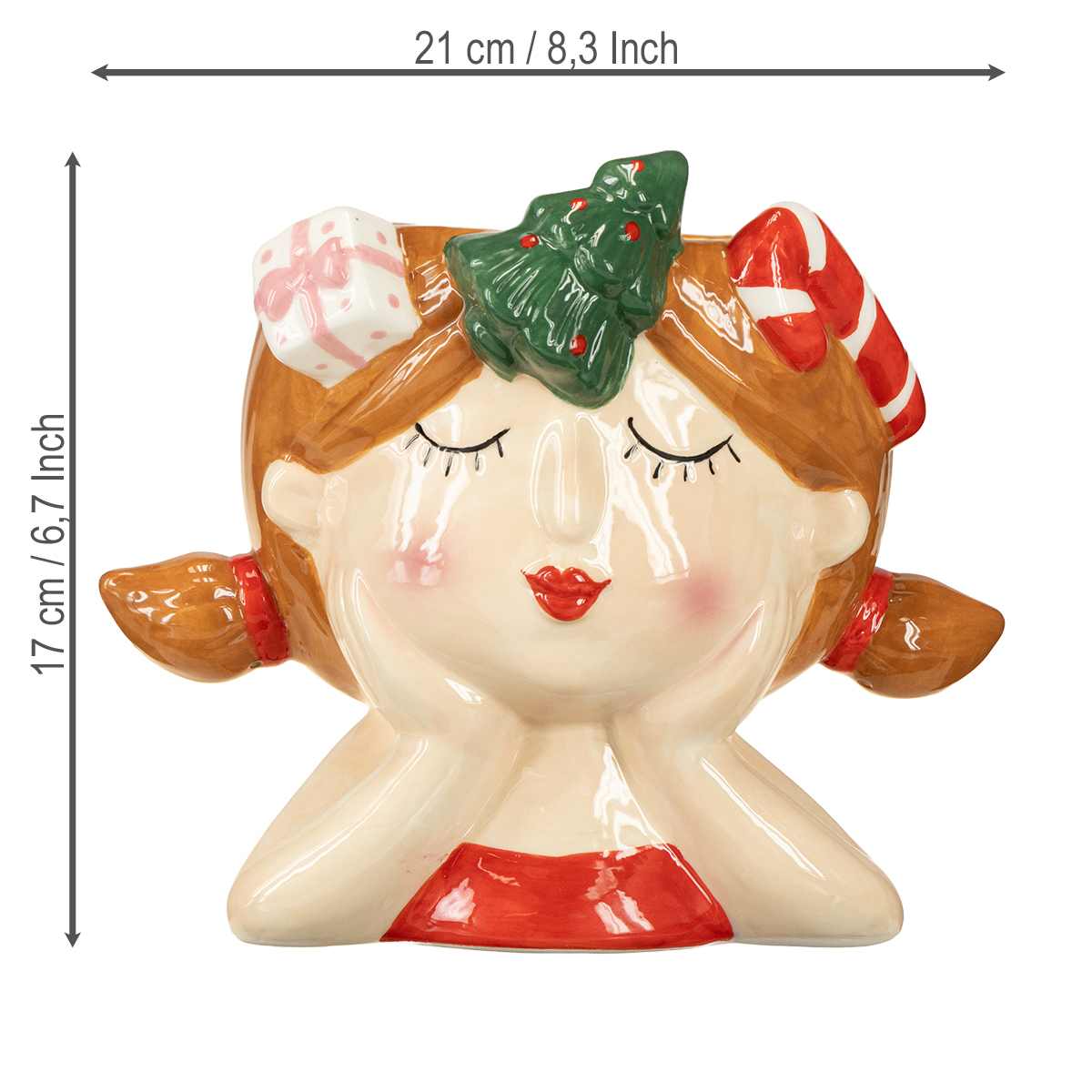 Julen er rett rundt hjørnet, og du leter etter noe som kan gjøre din juledekorasjon virkelig unik? Da vil denne fortryllende keramiske blomsterkrukken umiddelbart få deg til å smile! Med sitt sjarmerende design i form av en drømmende jente med julepynt i håret, bringer denne blomsterkrukken ikke bare en munter julestemning inn i hjemmet ditt, men den viser også vakkert frem enhver plante eller adventspynten din. Spesielt slående er de kjærlige detaljene på bysten, som de røde båndene, hennes drømmende blikk og de små juleelementene som et mini-juletre og en sukkerstang i håret. Dette gjør blomsterkrukken perfekt for alle som ønsker å tilføre et snev av humor til dekorasjonene sine!