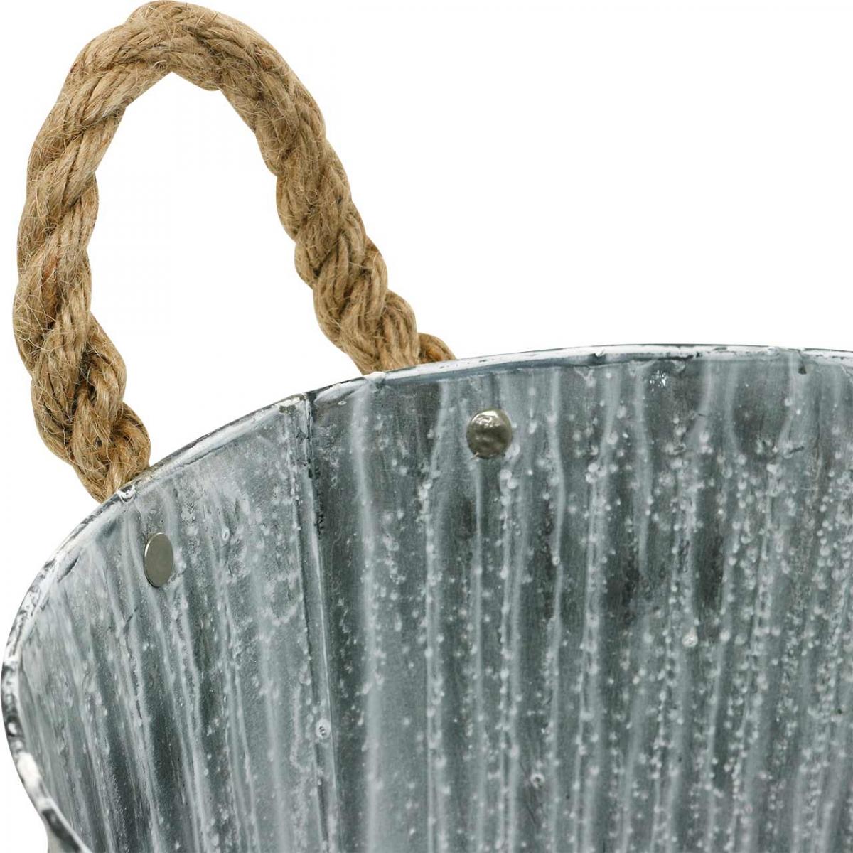 Denne planter er en fantastisk metalldekorasjon i trendy shabby chic! Vertikale pregede linjer rundt, som ble fremhevet i kontrast ved å vaske hvitt, pryder den vakre dekorative potten med håndtak laget av jute på begge sider.