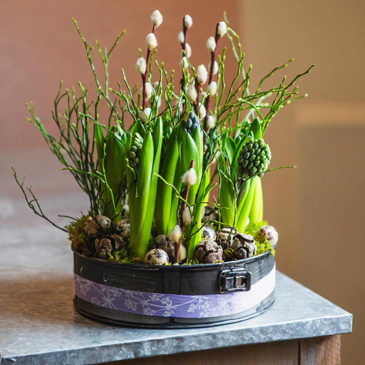 Denne dekorative bakepannen er en metalldekorasjon og en planter i en! Plantebollen i form av en springform er like velegnet som en tallerken for arrangementer som den er som en planter for en stor eller flere mindre blomsterpotter. Fjærformen kan også brukes til å plante direkte. Hvis blomsterdekorasjonen skal vannes, bør du dekke metallbeholderen med plantefilm på forhånd.
