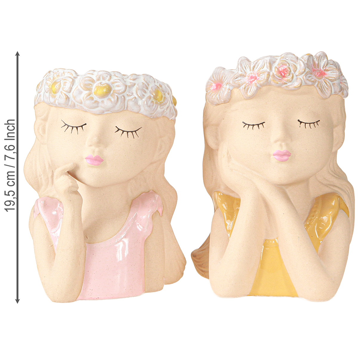 De to delvis glaserte plantekassene er tilgjengelige i assorterte farger med rosa og beige bluser, med de keramiske figurene i forskjellige positurer. En av jentene fremstår som mer drømmende, den andre mer gjennomtenkt. Derfor er figurene perfekte å plassere parvis på et langbord, på vinduskarmene, en skjenk eller på stuehyllen. Matchende tørkede blomster til disse keramikkvasene er også tilgjengelig her i Floristik24-butikken!