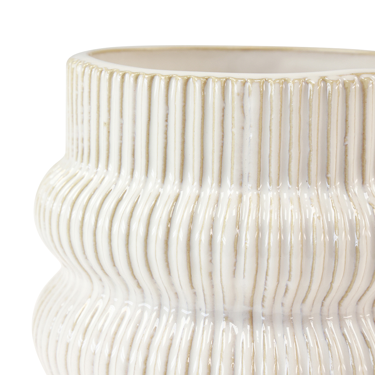 De vakre keramiske plantekrukkene har konsekvente vertikale riller. Keramikkens beige grunntone skinner gjennom i dypet av mønsteret.