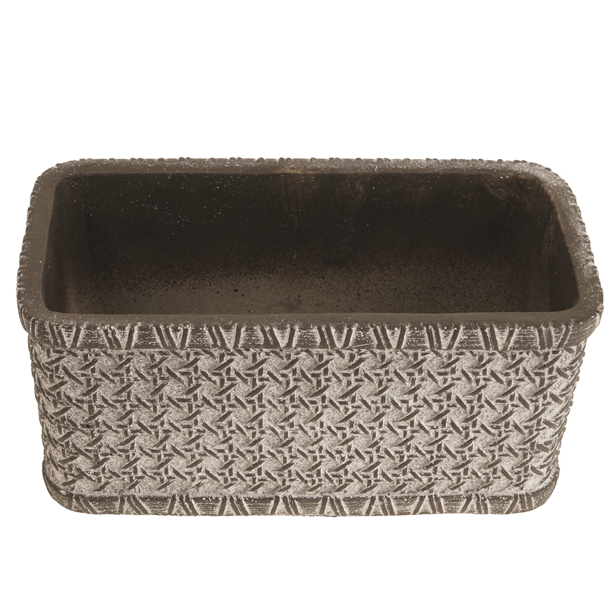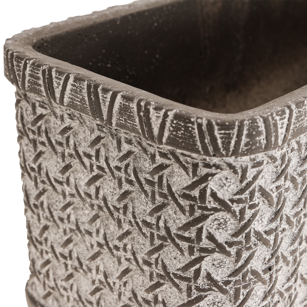 Innsiden av den keramiske potten er grå og brun og bør kles med folie før planting for å sikre at det ikke slipper ut vann. Det pregede flettemønsteret er vasket hvit-grå og er derfor imponerende.
