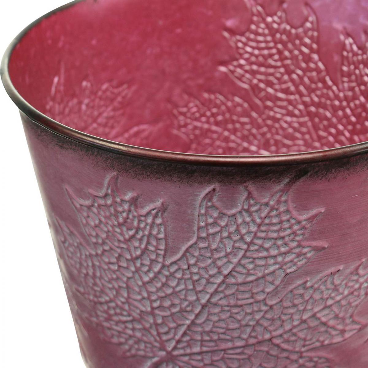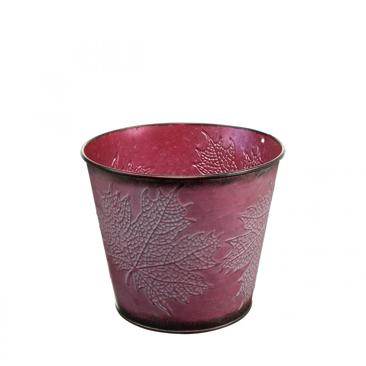 Plantekrukke med bladdekor, høstdekor, metallpotte vinrød Ø16,5 cm H14,5 cm