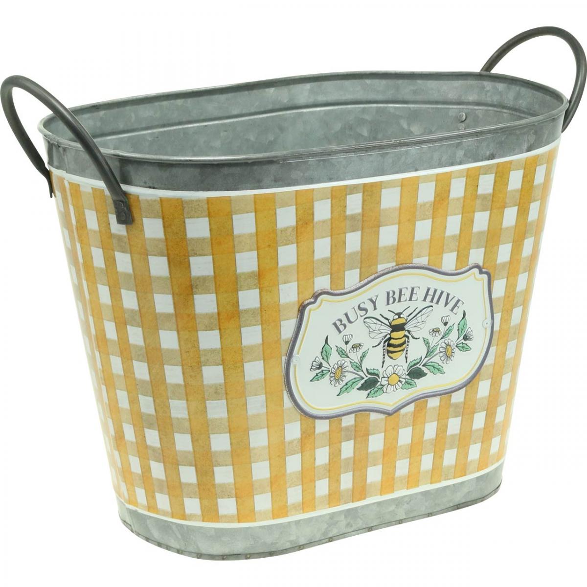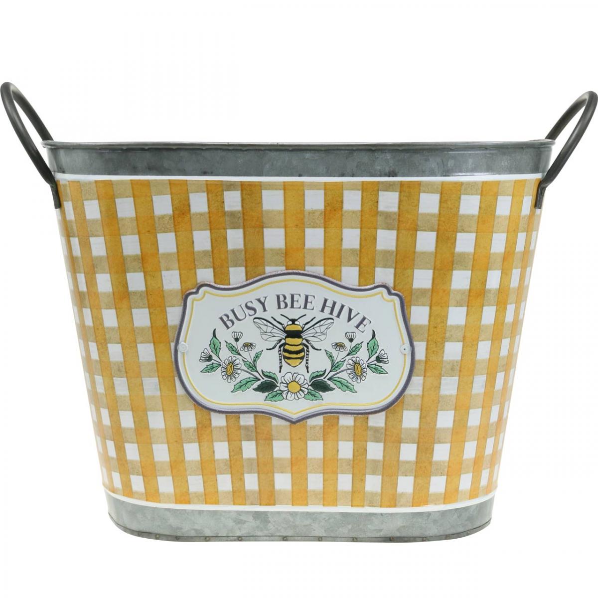 Den ovale plantekassen med bie er en flott sommerdekorasjon til balkong og terrasse. Det nostalgiske bimotivet ble også skrudd fast på plantekassen med håndtak som et preget metallskilt. Plantekassen er honningfarget og hvitrutet på utsiden. Kantene, håndtakene og innsiden av den forseggjorte metalldekorasjonen skinner sølv i sink. For å forlenge levetiden til det stilige metallkaret bør du fore karet med folie før planting.