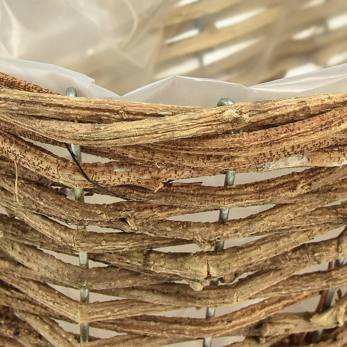 Vår ovale plantekurv er mer enn bare en beholder. De finvevde vingrenene danner sammen med den stabiliserende metallristskålen en robust blomsterskål. Den innsatte folien, festet med mørkebrunt garn, beskytter planteskålen mot fuktighet. Med en lengde på rundt 30 centimeter er denne dekorative plantekurven ideell for dine blomsteroppsatser eller som en slående borddekorasjon ved arrangementer.