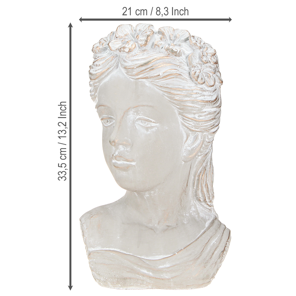 Plantepotten er designet som en skulptur av en kvinne laget av støpestein med et antikt utseende og er det perfekte blikkfanget for ethvert rom. Med sine dimensjoner på ca. 21×17,5×33,5 cm kombinerer den elegant estetikk og funksjonell bruk i et unikt dekorativt objekt. Den detaljerte utformingen av ansiktstrekk og hår, som minner om klassiske skulpturer, gir denne plantekassen et spesielt preg. Kvinnens hode, dekorert med en blomsterkrans, bringer antikk stil til hjemmet ditt. Den grasiøse formen og robuste utførelse gjør bysten til et langvarig tilbehør til hagen eller interiøret. Plantepotten passer fantastisk inn i ulike interiørstiler, det være seg landsted, klassisk eller shabby chic. Kombinasjonen av hvite og gullaksenter på en grå bakgrunn skaper et harmonisk helhetsbilde. Perfekt for dekoratører, gjør-det-selv-entusiaster og alle som elsker noe spesielt.