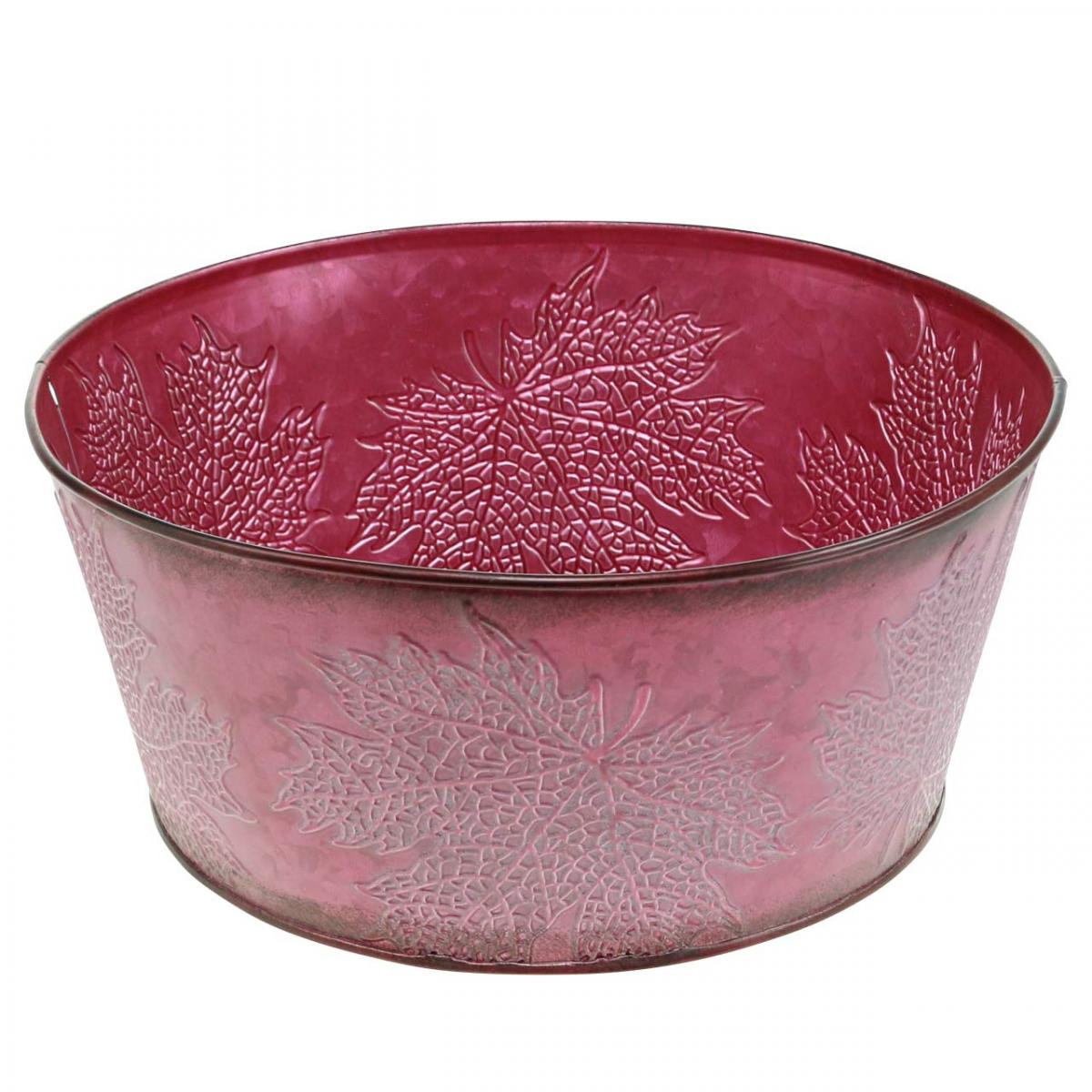 Planteskål for høsten, metallbeholder med bladdekor, dekorativ potte vinrød Ø25cm H11cm