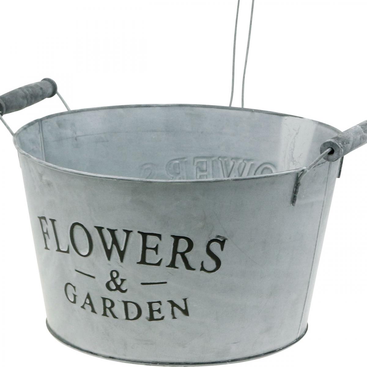 Det store metallkaret for planting har to håndtak med trehåndtak og to buede metallstenger lar en liten dekorativ vannkanne flyte over metallskålen. Det ser ut som om metallboksen tømmer blomsterdekorasjonen i plantekassen.