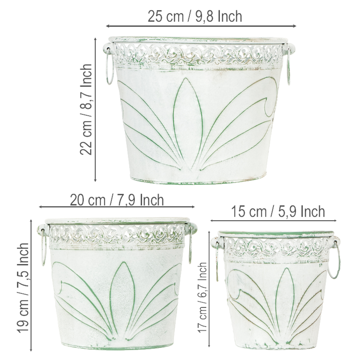 Preget metallplantekasse med håndtak, hvit og grønn, shabby chic-stil, H22/19,5/17,5 cm, Ø25,5/20,5/15,5 cm, sett med 3 stk.