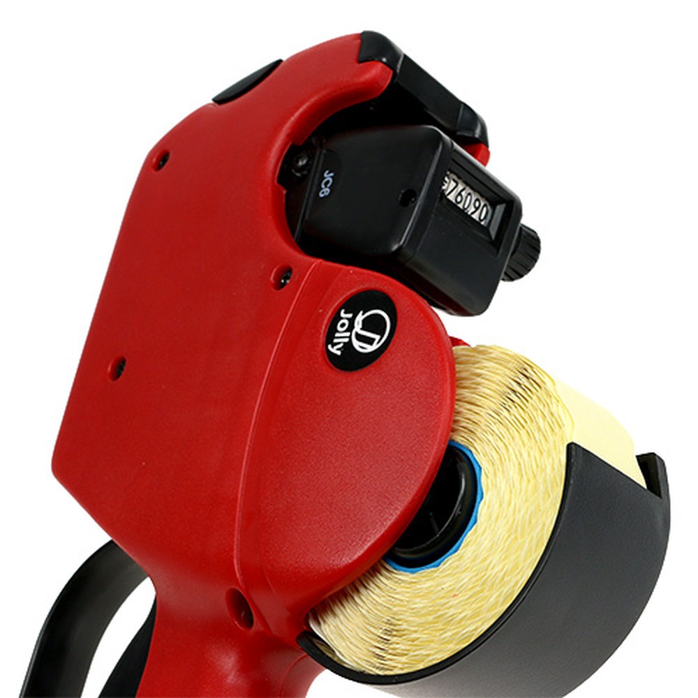 Prismerkemaskinen er allerede levert med etikettrull. Størrelsen på merkeenheten er omtrent 25 × 13 centimeter og bruker selvklebende prisetiketter med omtrentlige dimensjoner på 26 × 12 millimeter. Med unntak av skruer og fjærer, er merkeenheten laget utelukkende av høykvalitets plast. Båndet og etikettrullen kan også endres i noen få enkle trinn.