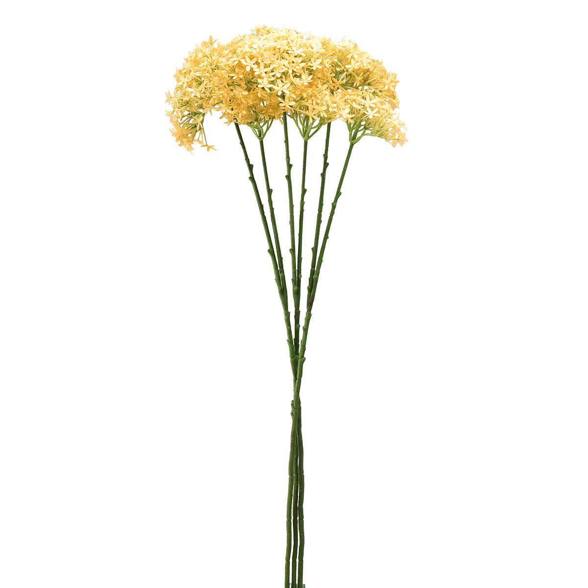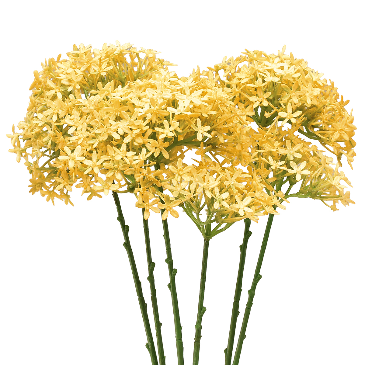 Du får tre av de flotte gule engblomstene, så du får totalt seks blomsterstander i forskjellige størrelser til dine kranser, buketter og arrangementer. I vår butikk finner du også kunstig allium som kuleblomster i rosa, hvitt og mange nyanser av rosa og lilla - samt et enormt utvalg av andre kunstige blomster!