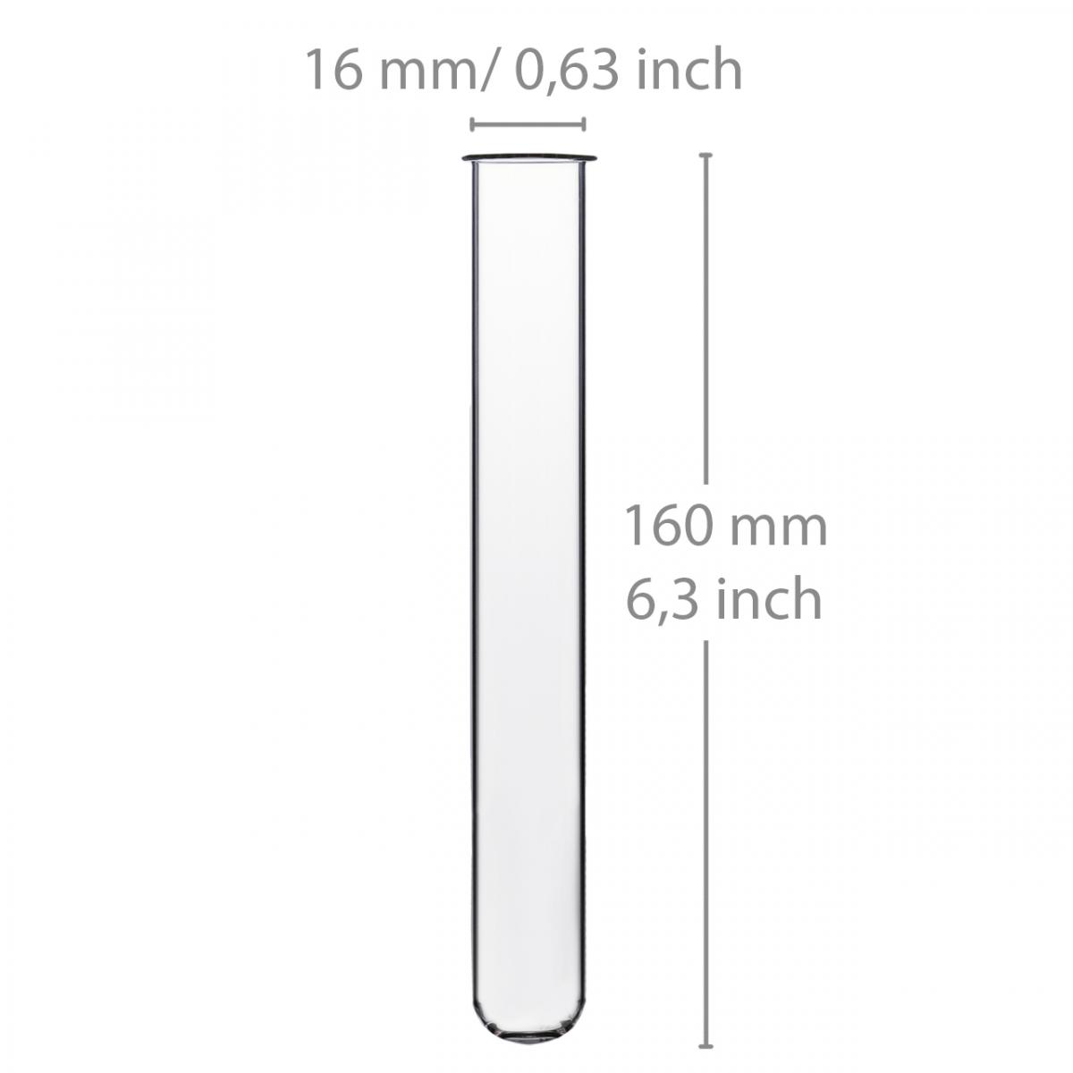 Testrøret er laget av fargeløst glass og tilbys individuelt. Med en ytre diameter på omtrent 21 millimeter og en indre diameter på omtrent 16 millimeter, er den omtrent 160 millimeter lang. Den har en utover buet kant.