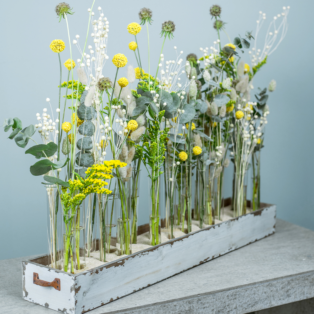 Ved hjelp av innkjøpte eller egenproduserte prøverørsstativ laget av tre eller prøverørholdere laget av metall, kan flere av rørene brukes veldig pent til en feiring som et bryllup: På kirkebenkene eller på bankettbordet, de ser spesielt bra ut med delikate blomsterkomposisjoner. Vannrørene trenger ikke å bli innlemmet i et overdådig arrangement, men kan settes inn på en veldig sofistikert og godt synlig måte med en enkelt blomst, for eksempel i en flat kuboid av tre med utskårne hull. Dette skaper en avslappet herregårdsfølelse, for eksempel i et låvebryllup eller i stuen din.