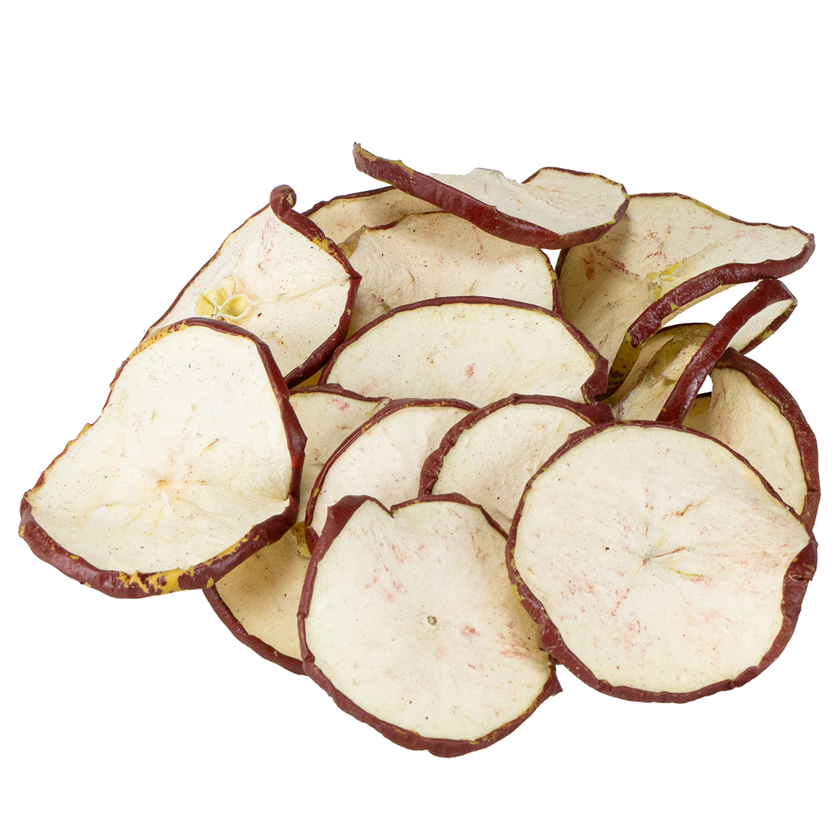 Epleskivene i rødt er i en 500 gram pose og avviker litt i størrelse, som vanlig med naturlige produkter. Skivene er mellom 4 og 5 centimeter store, noe som gjør eplene perfekte for å lage vakre fruktkranser. Så fester om høsten som Halloween er den perfekte anledningen til en så vakker romdekorasjon.