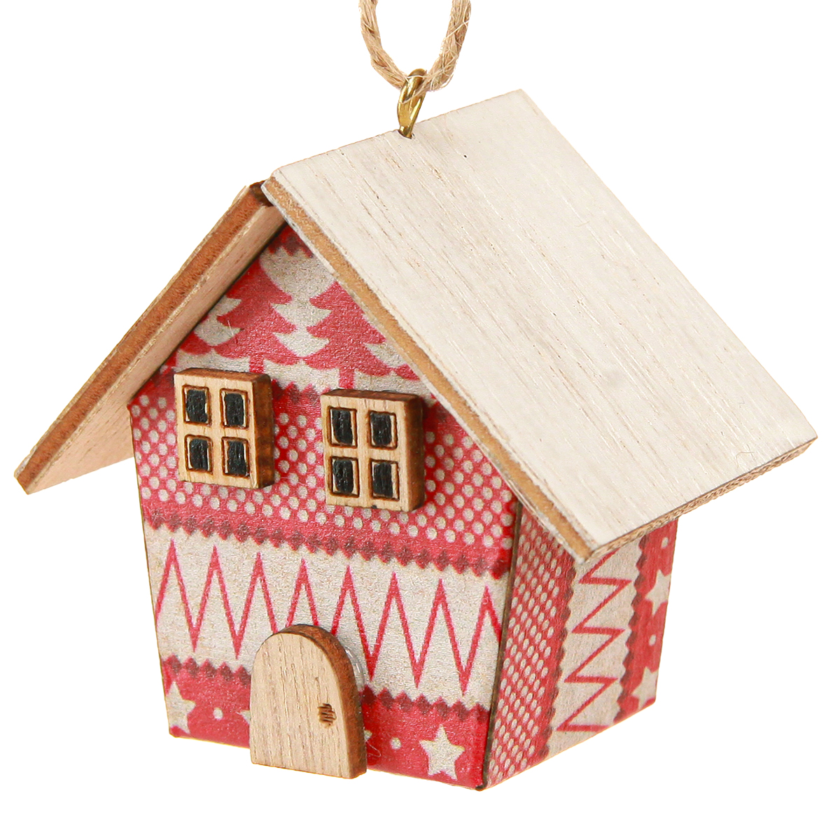 Produktnavn: Røde julehus til oppheng, papir og tre, 5,5 cm, sett med 6