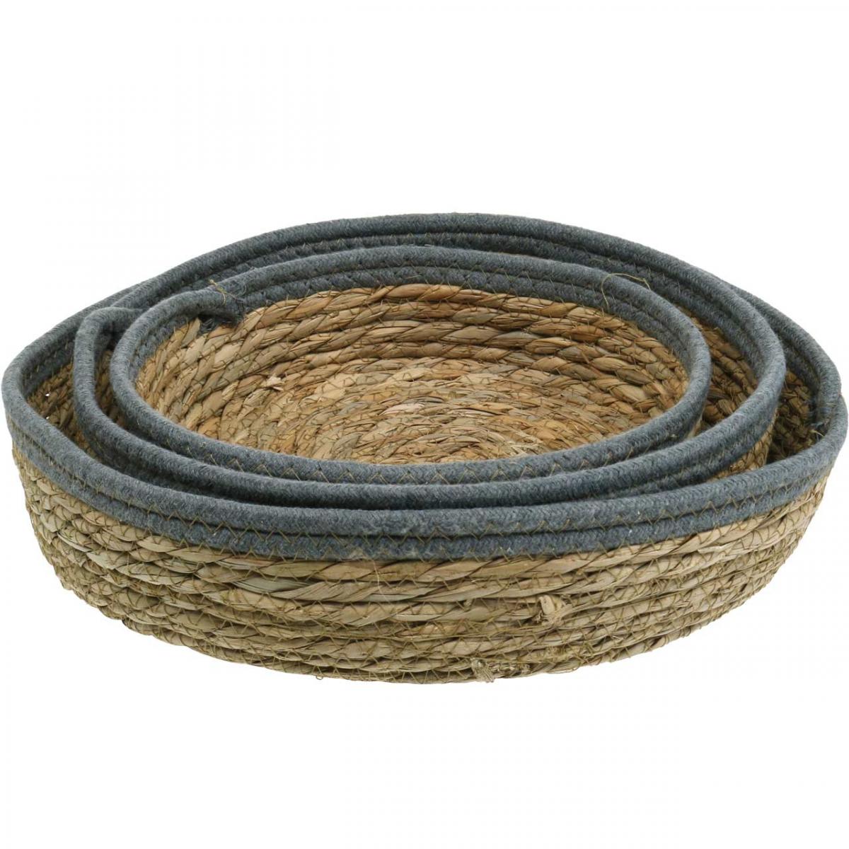Settet med dekorative brett vevd av siv, som ble tvunnet og deretter sydd sammen med garn, er et attraktivt dekorativt objekt i seg selv. På den øvre kanten av den dekorative kurven danner et grått bånd en pen finish.