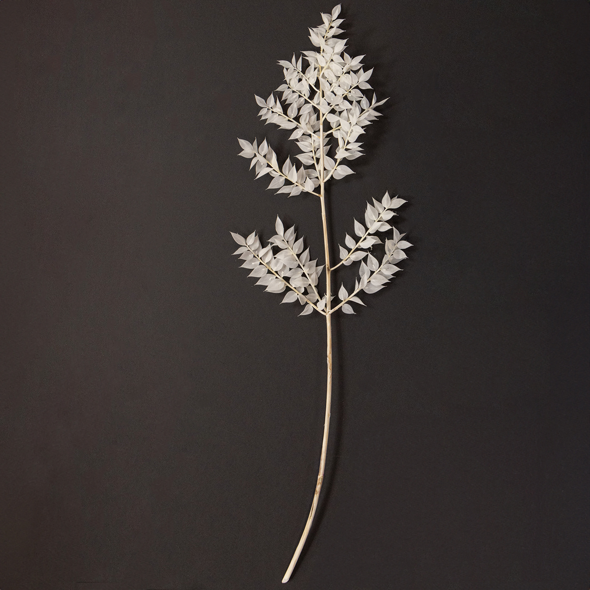 Den blekede Ruscus-planten, med sin lyse kremfarge, kan brukes til å skape en rik kontrast med tørkede planter, dekorative grener og eksotiske planter i rødt, svart, grønt eller rosa, noe som gjør at den virker mer subtil enn rent hvite dekorative grener.