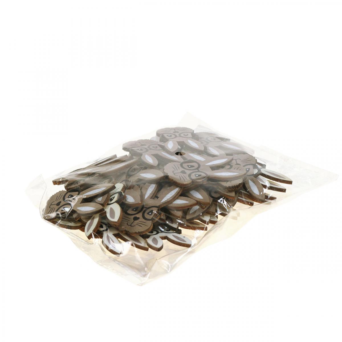 Kaninen med briller har blitt en skikkelig trend og derfor har disse søte kaninhodene også en bred innrammet og stor ramme. Selvfølgelig, i likhet med resten av scatter-dekorasjonen, er dette peppe-limte dekorative elementet utelukkende laget av tre. Et smilende kaninansikt er malt på hver spredebit. Øynene ser ut som små trekanter, nesen som et hjerte, med neseryggen og munnen som et lite anker under. Som et søtt ekstra, har trekaninene også værhår og innsiden av ørene er fremhevet i farger.