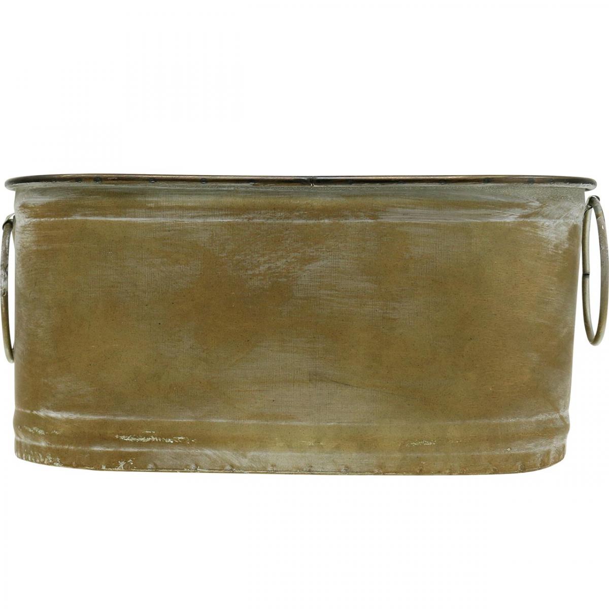 Cachepottene i settet med 3 er formet som små kar. Utsiden av metallkarene er vasket kobberhvitt. Fargen og formen er retrostil, noe som gjør dem egnet for en vintage borddekning. Retrokarakteren understrekes av de store bevegelige ringene som fungerer som håndtak.