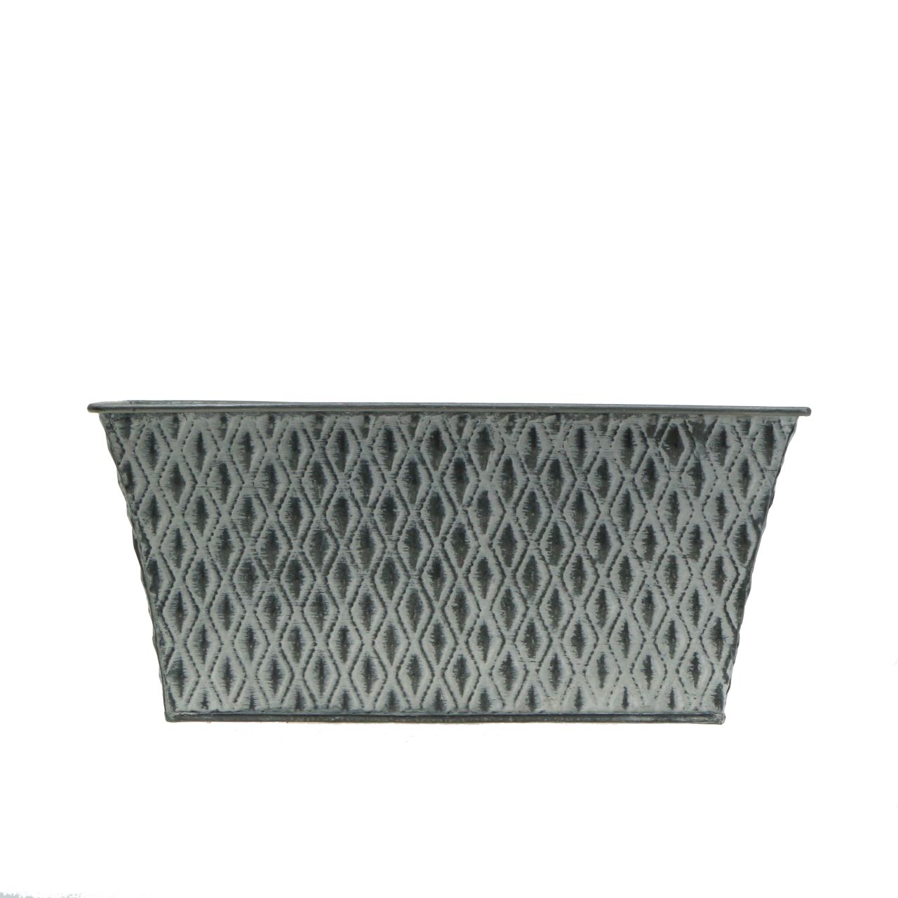 Den rektangulære sinkpotten med diamantmønster har dimensjonene ca. 22 x 12 centimeter. Høyden er rundt 8,5 centimeter.